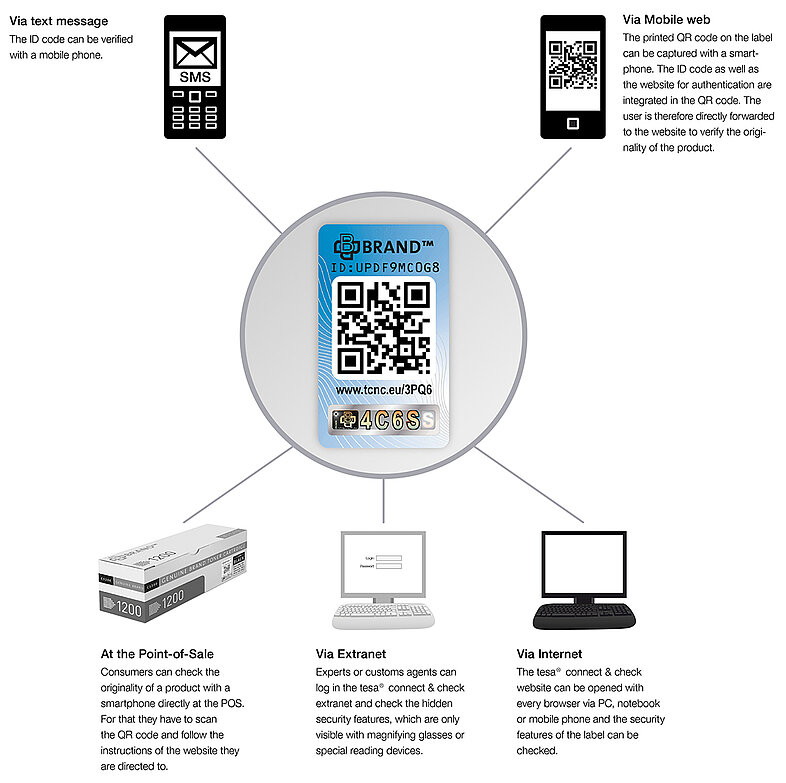 Customers, retailers and investigators can check a product directly on site via mobile phone, notebook or PC. As shown in the image, consumers can, for example, scan the QR code with their smartphone directly at the point of sale and enter the security code.