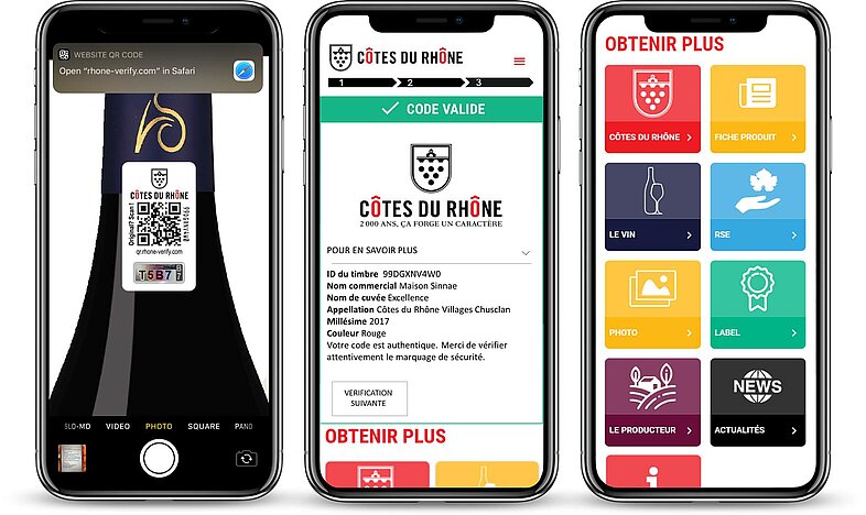 在对葡萄酒进行正品验证后,还将为客户提供更多详情: 葡萄酒的详细信息、生产商网站、罗纳河谷网站、当地经销商、抽奖游戏、卡路里信息、环保措施等等。除此之外: 客户可以很方便地与葡萄酒制造商取得联系。 制造商则可以通过直观的数字平台管理其认证标签。 认证标签的所有扫描信息与相关位置和时间信息将被存储在系统中,因此制造商能确切知悉葡萄酒所在位置。