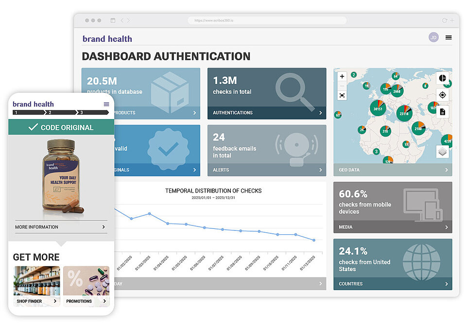 SCRIBOS 360 数字平台实时采集并分析产品交互数据,为高效的品牌防伪和风险管理提供可执行的市场情报。