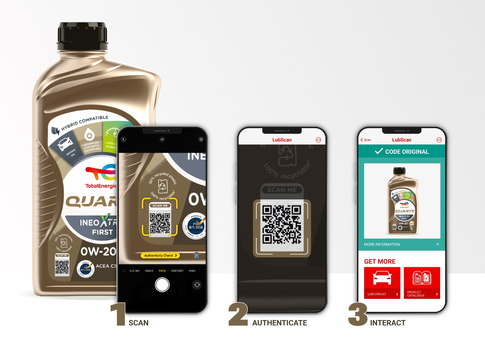 每个产品包装均印刷防伪二维码ValiGate®,客户可直接用智能手机即时扫描,无需专门的应用程序。该特征与Lub360数字平台相连,这是基于Lub360数字平台定制的专属版本。Lub360数字平台整合两大无缝协同模块:认证与分析模块支持现场实时鉴别产品真伪、追踪扫描活动并识别假冒模式;客户互动模块则在每次扫描后提供品牌化数字体验。