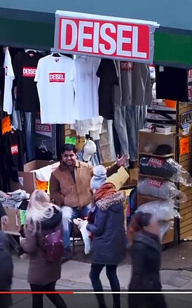是一个成功的市场营销策略。但是传达的信息却让人产生了不同的意见。当然要先看内容。可以看到这是一家位于纽约唐人街区坚尼街 (Canal Street) 上的典型的快闪店 (Pop-Up Store),里面销售看似可疑的“品牌”产品。Diesel 这个品牌名写错了——在破旧的店面上方用大写字母写着的 DEISEL 引人注意。店内有两位销售员在招揽顾客,他们向顾客介绍衣服具有很好的质量和极其便宜的价格。一些潜在客户指出 Deisel 的品牌名拼写错误,因此几乎不能作为原版进行交易。而其他人则发现,这些可能是假冒产品的衣服做得不错,所以购买了。实际上这些是原版产品,拥有和所有其他 Diesel 产品一样的生产工艺。只是改变了 Logo。