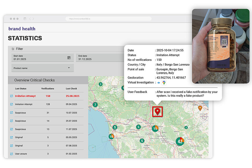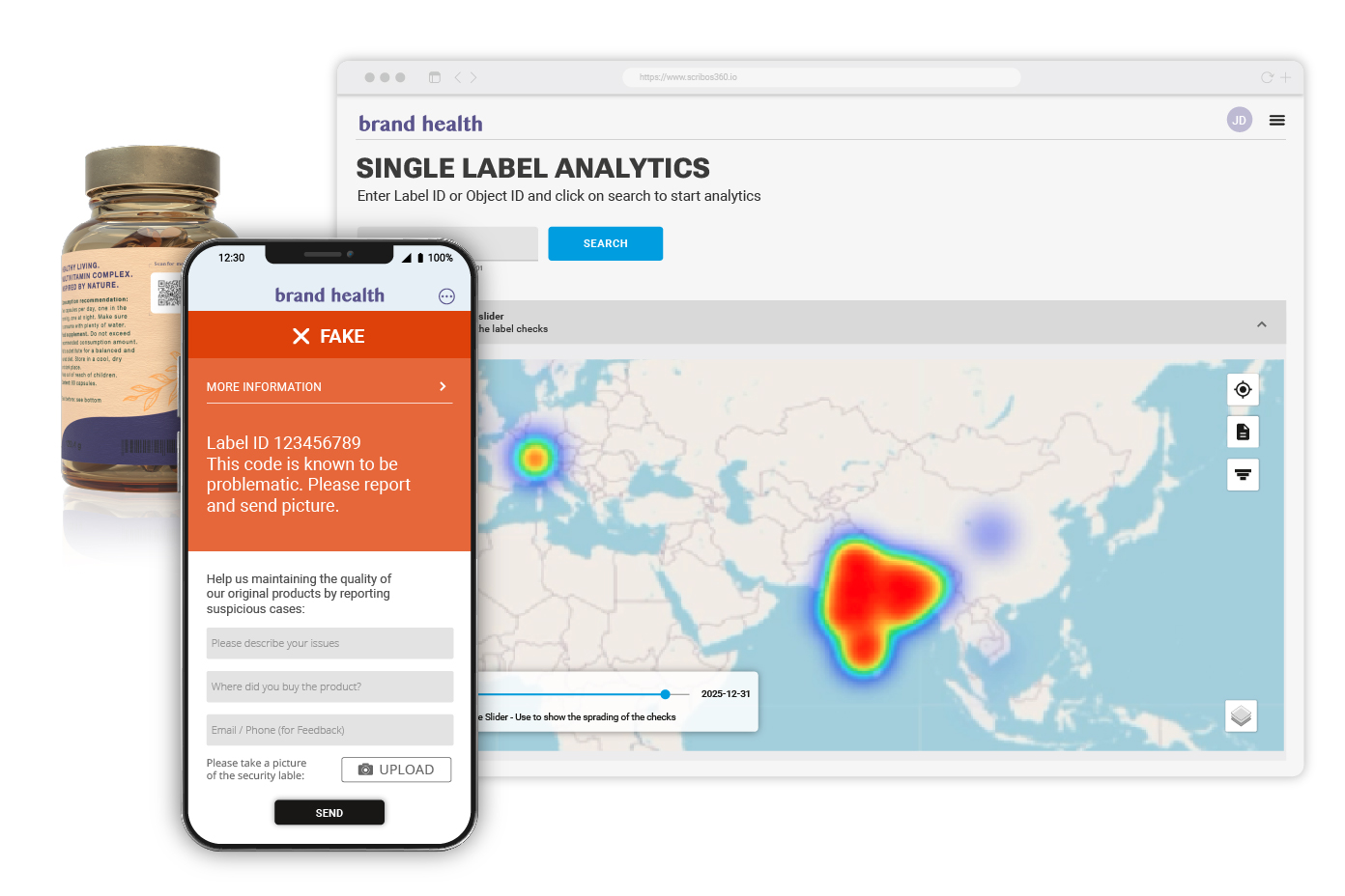 SCRIBOS 360 数字平台实时采集并分析产品交互数据,为高效的品牌防伪和风险管理提供可执行的市场情报。